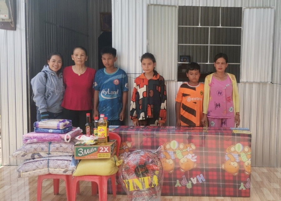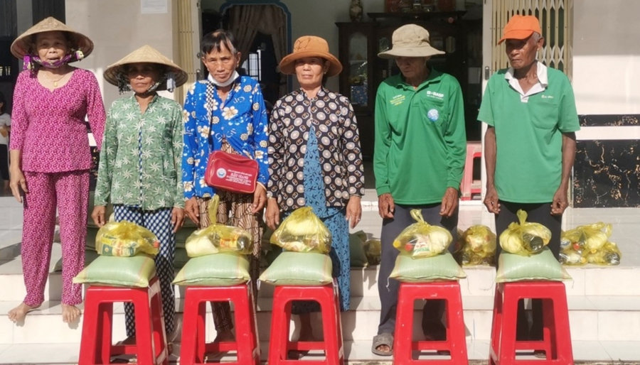 Ảnh: Bà Nguyễn Thị Kim Liên (ngoài cùng, bìa trái) vận động trao quà cho hộ nghèo trên địa bàn ấp Hòa Tạo.