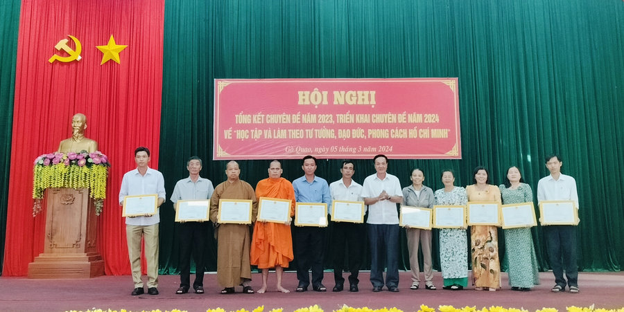 Ảnh: Bà Nguyễn Thị Kim Liên (thứ 5 từ phải qua) nhận giấy khen của Ủy ban nhân dân huyện vì có thành tích xuất sắc trong thực hiện học tập làm theo Bác tại hội nghị tổng kết học tập làm theo Bác chuyên đề năm 2023 “Học tập và làm theo tư tưởng, đạo đức, phong cách Hồ Chí Minh về phát triển kinh tế, đảm bảo an sinh xã hội, nâng cao đời sống nhân dân” do Huyện ủy Gò Quao tổ chức.
