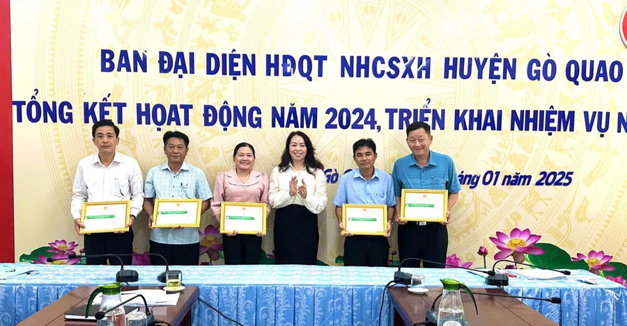Ảnh: Bà Nguyễn Thị Mỹ Nương (thứ ba từ phải qua) - Phó Giám đốc NHCSXH tỉnh Kiên Giang trao giấy khen của UBND huyện Gò Quao cho các tập thể có thành tích xuất sắc trong trong công tác củng cố nâng cao chất lượng hoạt động, chất lượng tín dụng và triển khai tín dụng chính sách trong năm 2024.