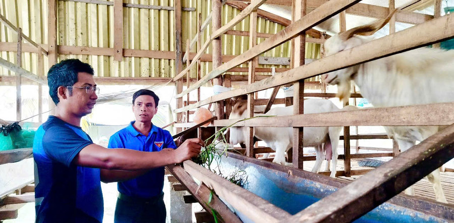 Ảnh: Bạn Danh Trí Đức (ngoài cùng) - Bí thư Chi đoàn ấp An Hiệp, trao đổi cùng anh Lương Hoàng Vinh - Bí thư xã Đoàn Định An về mô hình nuôi dê của gia đình.