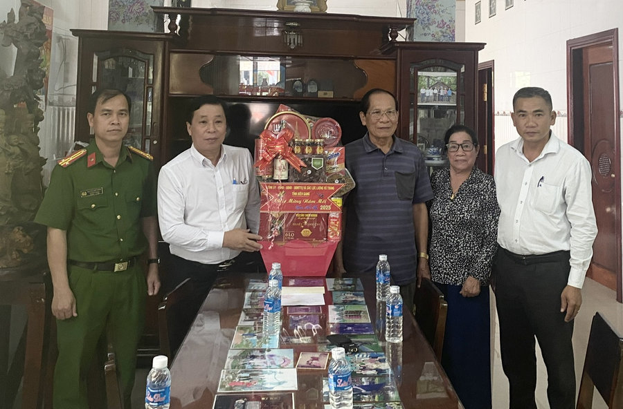 Ảnh: Đồng chí Trần Thanh Việt (thứ hai từ trái qua) Tỉnh ủy viên, Bí thư Huyện ủy đến thăm chúc tết đồng chí Dương Tâm Bá – Nguyên tỉnh ủy viên, Chủ tịch Hội nông dân tỉnh, nguyên Bí thư Huyện ủy, huy hiệu 50 năm tuổi đảng.