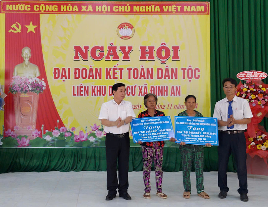 Dịp này, Bí thư Huyện ủy Trần Thanh Việt vận động trao tặng 01 căn nhà đại đoàn kết trị giá 55 triệu đồng cho hộ Bà Thị Hương, Ấp An Thuận, Mặt trận Tổ quốc xã vận động Ông Dương An, cửa hàng vật liệu xây dựng xã Vĩnh Phú, huyện Giồng Riềng trao tặng 01 căn nhà đại đoàn kết trị giá 70 triệu đồng cho hộ bà Thị Tư, Ấp An Phước; Ủy ban mặt trận Tổ quốc Việt Nam huyện trao tặng 10 suất quà mỗi suất trị giá 300 ngàn đồng cho các gia đình thuộc diện hộ nghèo, hộ khó khăn trên địa bàn xã. Mặt trận Tổ quốc Việt Nam xã cũng vận động 1 tấn gạo để trao tặng cho các hộ nghèo, hộ cận nghèo, hộ có hoàn cảnh khó khăn trên địa bàn xã.