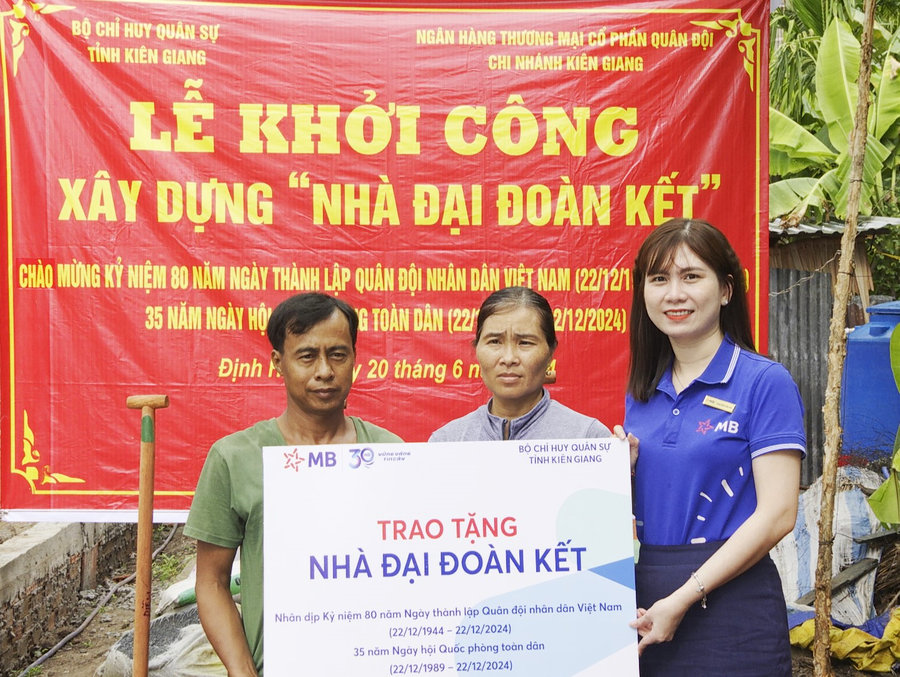 Ảnh: Đại diện Ngân hàng Thương mại cổ phần Quân đội, Chi nhánh Kiên Giang trao bảng tượng trưng hỗ trợ kinh phí xây dựng nhà Đại đoàn kết cho gia đình anh Danh Tấn Phát.