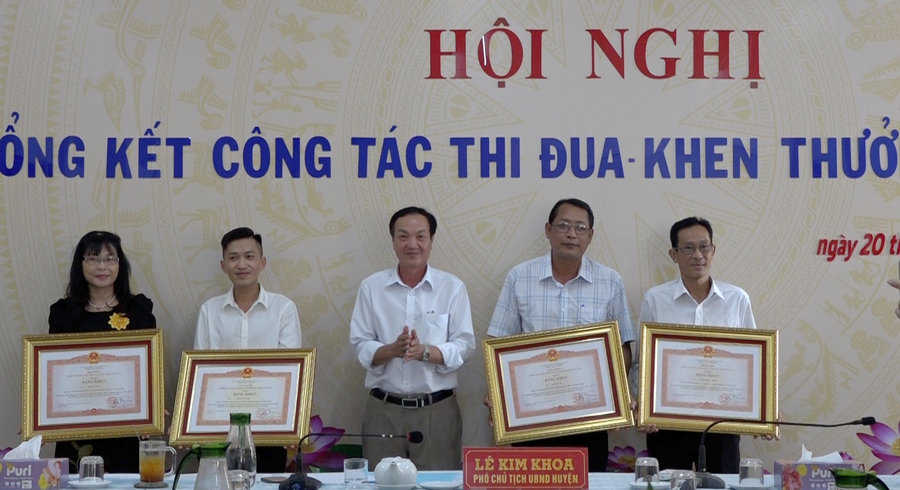 Ảnh: Cô giáo Vũ Thị Hồng Thơm (bìa trái) – nhận bằng khen của Thủ tướng Chính phủ tại hội nghị tổng kết công tác thi đua, khen thưởng năm 2023, triển khai phương hướng nhiệm vụ năm 2024, huyện Gò Quao.