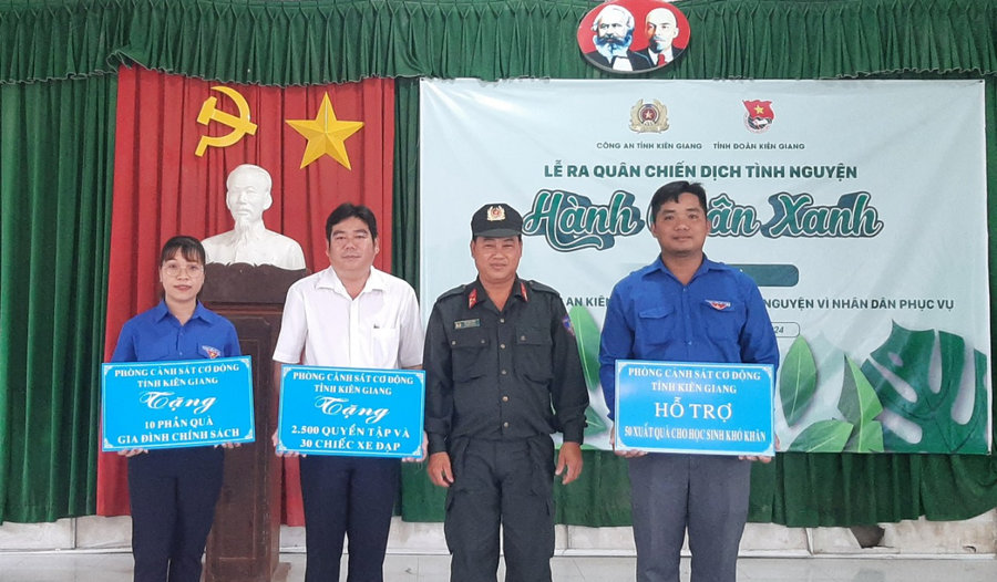 Chiến dịch “Hành quân dã ngoại” lần này, Công an tỉnh Kiên Giang trao tặng 10 phần quà cho gia đình chính sách; 50 suất quà, 2.500 quyển tập và 30 xe đạp cho các em học sinh nghèo chịu khó học học giỏi, tổng trị giá 67.500.000đ. Công an tỉnh hỗ trợ 100 triệu đồng, nhân dân trên địa bàn đóng góp ngày công lao động xây dựng cầu giao thông nông thôn tại ấp 4.