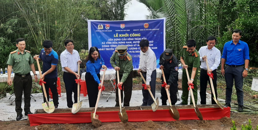 Ảnh: Lãnh đạo Tỉnh, Huyện, xã thực hiện nghi thức khởi công cầu GTNT tại ấp 4