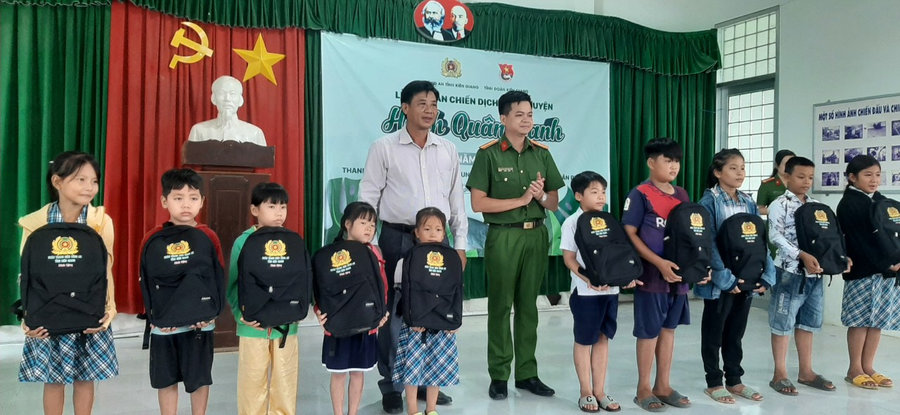 Ảnh: Lãnh đạo Huyện ủy Gò Quao, Công an tỉnh tặng quà cho các em học sinh nghèo chịu khó học giỏi.