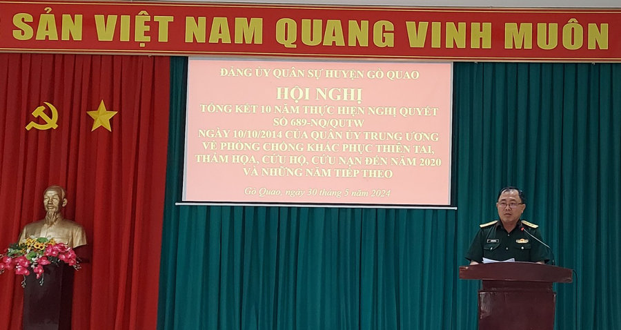 Trong thời gian tới, Đảng ủy Quân sự huyện Gò Quao tiếp tục tập trung lãnh đạo, chỉ đạo quán triệt sâu sắc và thực hiện tốt Nghị quyết số 689 và các văn bản của cấp trên về công tác phòng, chống, khắc phục hậu quả thiên tai, thảm họa, cứu hộ, cứu nạn; chuẩn bị tốt nhân, vật lực đảm bảo công tác này thực hiện theo đúng phương châm "4 tại chỗ"; đánh giá đúng, sát tình hình biến đổi khí hậu, tính chất địa lý từng địa bàn và đặc điểm dân cư để xây dựng phương án phù hợp thực tế. Đảng ủy Quân sự huyện tiếp tục làm tốt công tác tham mưu cho cấp ủy, chính quyền và phối hợp chặt chẽ với các đơn vị liên quan trong việc duy trì nghiêm chế độ trực ở các cấp khi có diễn biến xấu về thời tiết, khí hậu để chuẩn bị sẵn phương án phù hợp đồng thời lãnh đạo, chỉ đạo chặt chẽ công tác huấn luyện cứu hộ, cứu nạn theo chương trình, kế hoạch quy định...Tiếp tục lãnh đạo, chỉ đạo công tác giáo dục, tuyên truyền nâng cao nhận thức, trách nhiệm cho cán bộ, chiến sĩ lực lượng vũ trang huyện nhận thức sâu sắc các chỉ thị, nghị quyết của Đảng, Nhà nước và của cấp ủy, chỉ huy các cấp về phòng, chống khắc phục hậu quả thiên tai, thảm họa, cứu hộ - cứu nạn; thấy rõ tính chất khó khăn, phức tạp, những thiệt hại to lớn do thiên tai, thảm họa gây ra; hiểu rõ ý nghĩa, tầm quan trọng của nhiệm vụ, sẵn sàng nhận và hoàn thành tốt mọi nhiệm vụ được giao./.
