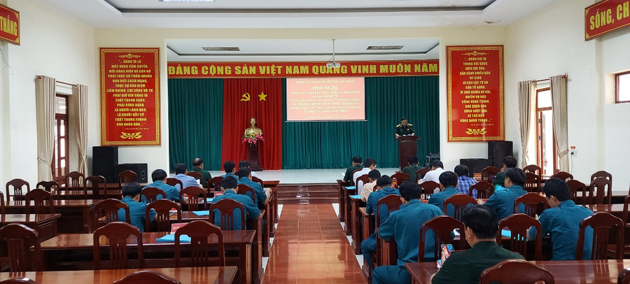 Ảnh: Thượng tá Nguyễn Văn Lẹ, Phó Bí thư Đảng ủy, Chính trị viên ban chỉ huy quân sự huyện phát biểu tại hội nghị.