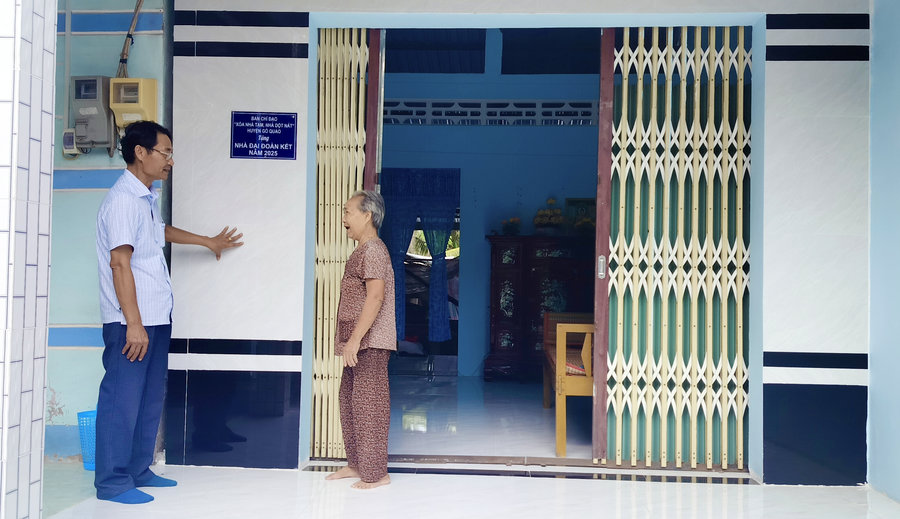 Ảnh: Ông Quảng Trọng Dũng (bên trái) – Trưởng Khối Dân vận, Chủ tịch Ủy ban Mặt trận Tổ quốc, Phó Trưởng Ban chỉ đạo xóa nhà tạm, nhà dột nát xã Định An thăm hỏi bà Dương Thị Lụa, ấp An Phước vừa mới được bàn giao nhà đại đoàn kết từ chương trình xóa nhà tạm, nhà dột nát năm 2025.