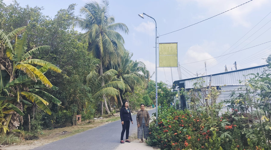 Ảnh: Bà Thị Hiệp (bên phải) trao đổi cùng cán bộ xã Thới Quản về cách thức đóng góp kinh phí và quá trình thực hiện của bà và người dân trên tuyến để hoàn thành công trình thắp sáng đường quê trên địa bàn ấp.