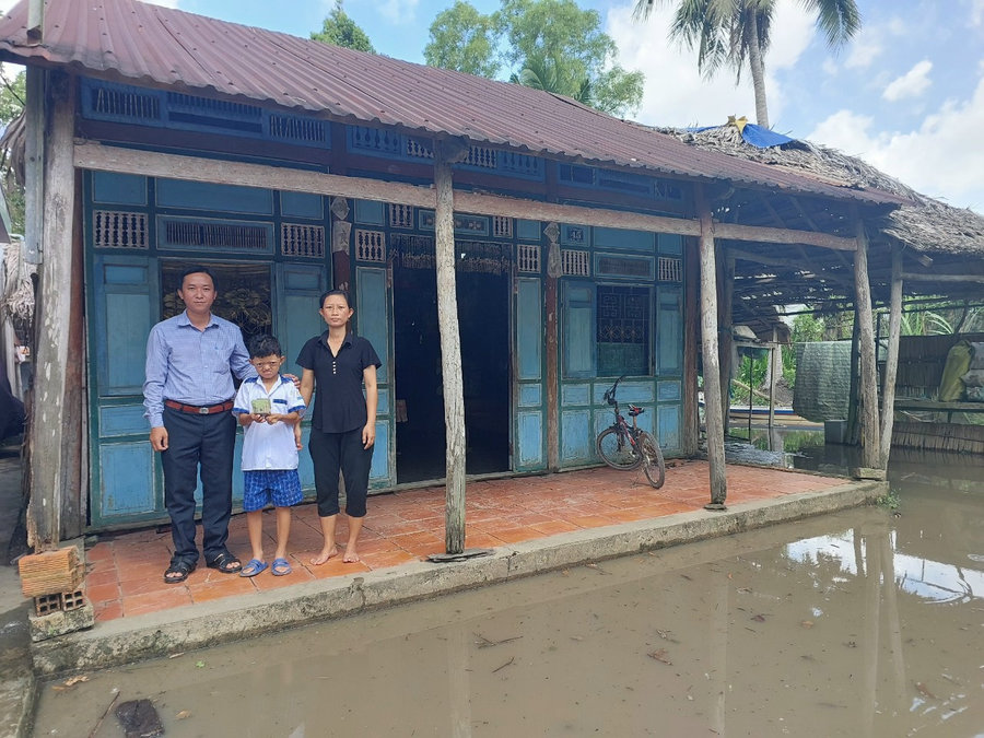 Ảnh: Đồng chí Lê Thanh Tổng (bên trái), Phó chủ tịch Uỷ ban Mặt trận Tổ quốc xã Vĩnh Hoà Hưng Bắc trao tiền hỗ trợ của các mạnh thường quân ủng hộ giúp đỡ cho gia đình em Lưu Văn Linh.