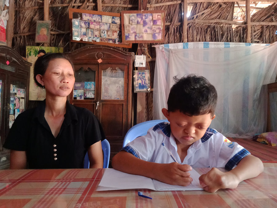 Ảnh: Dù bị dị tật bàn tay nhưng em Lưu Văn Linh (bên phải) rất cố gắng học tập.