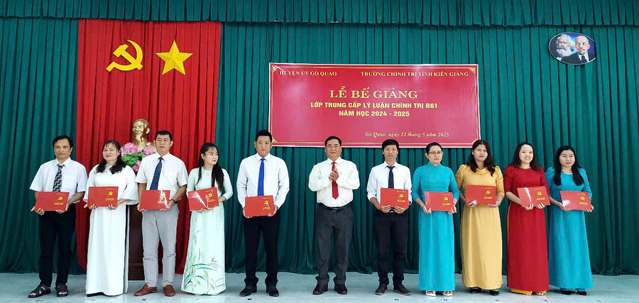 Ảnh: Thạc sĩ Lâm Phước Hải (thứ tư từ phải qua) Tỉnh ủy viên, Bí thư Đảng ủy, Hiệu Trưởng Trường chính trị tỉnh Kiên Giang và đồng chí Nguyễn Xuân Hoài (thứ ba từ trái qua) Phó Bí thư Thường trực Huyện ủy, Chủ tịch Hội đồng Nhân dân huyện Gò Quao tặng Giấy khen cho các học viên đạt thành tích cao trong học tập và rèn luyện.