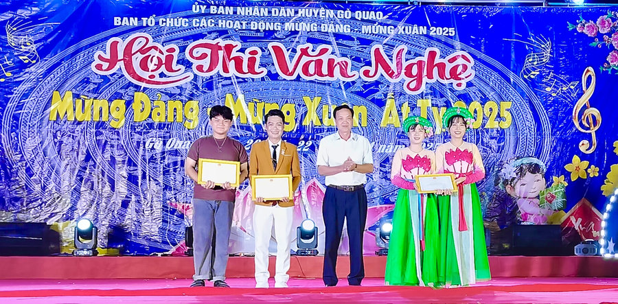 Ảnh: Đồng chí Lê Kim Khoa (đứng giữa) – Ủy viên Ban thường vụ, Phó Chủ tịch UBND huyện – Trưởng Ban tổ chức các hoạt động văn nghệ, thể thao, tuyên truyền mừng Đảng - mừng Xuân Ất Tỵ huyện Gò Quao năm 2025 trao giải toàn đoàn cho các đơn vị.