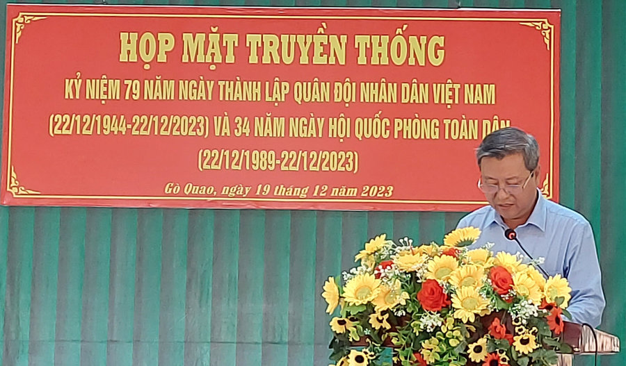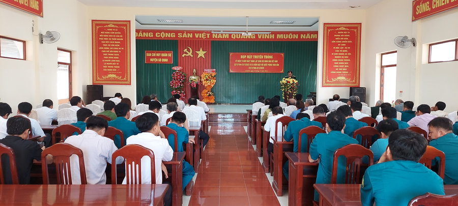 Phát biểu tại buổi họp mặt, Thượng tá Nguyễn Văn Lẹ, Chính trị viên Ban chỉ huy Quân sự huyện đã ôn lại chặng đường lịch sử vẻ vang, bất khuất của Quân đội nhân dân Việt Nam qua 2 cuộc kháng chiến giải phóng dân tộc, thống nhất đất nước và trong sự nghiệp xây dựng và bảo vệ Tổ quốc. Là một bộ phận của quân đội nhân dân Việt Nam, Dưới sự lãnh đạo của Đảng, Lực lượng vũ trang huyện Gò Quao đã kế thừa và phát huy truyền thống không ngừng phát triển, càng đánh, càng thắng, càng đánh càng lớn mạnh đã làm nên những chiến công oanh liệt, được ghi vào trang sử vẽ vang của quân, dân huyện Gò Quao anh hùng như trận Xẻo Giá, Lục Phi, Ba Quân, Rạch Rùa…các trận đánh tàu trên Sông Cái Lớn tiêu diệt và làm thất bại nhiều trận đánh phá, càn quét của địch.