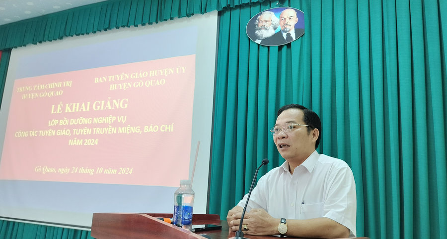 Phát biểu khai giảng lớp bồi dưỡng, đồng chí Nguyễn Vũ Huy - Ủy viên Ban thường vụ, Trưởng Ban Tuyên giáo Huyện ủy, Giám đốc Trung tâm Chính trị huyện nhấn mạnh: Lớp bồi dưỡng nghiệp vụ nghiệp vụ công tác Tuyên giáo, tuyên truyền miệng, báo chí năm 2024 có ý nghĩa quan trọng, nhằm trang bị cho cho đội ngũ cán bộ tuyên giáo, tuyên truyền viên những kiến thức bổ ích về các kỹ năng, nghiệp vụ về công tác Tuyên giáo, tuyên truyền miệng, báo chí, qua đó ngày càng hoàn thiện và không ngừng nâng cao nghiệp vụ, năng lực công tác, góp phần hoàn thành tốt nhiệm vụ chính trị được giao. Do đó, đồng chí Nguyễn Vũ Huy đề nghị các học viên tham gia đầy đủ các buổi học với tinh thần trách nhiệm, nghiêm túc; chú ý lắng nghe kết hợp nghiên cứu tài liệu, tăng cường trao đổi, thảo luận, liên hệ thực tiễn địa phương, đơn vị mình để từ đó vận dụng linh hoạt vào thực tiễn công tác, góp phần hoàn thành tốt nhiệm vụ được giao.
