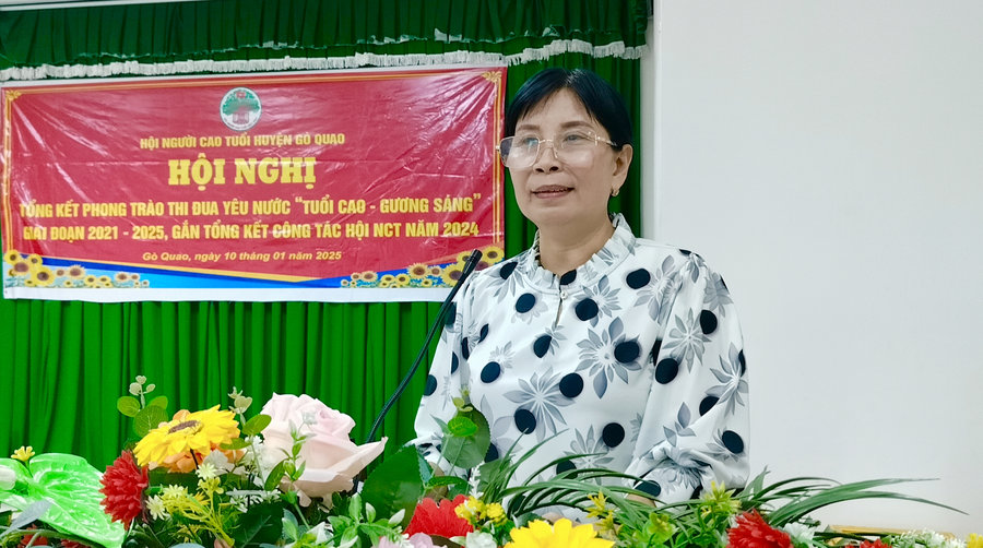 Phát biểu chỉ đạo hội nghị, đồng chí Phạm Thị Hòa – UVBTV, Trưởng Ban Dân vận, Chủ tịch UBMTTQVN huyện đánh giá cao những kết quả mà Hội NCT huyện Gò Quao đạt được trong thực hiện phong trào thi đua yêu nước “Tuổi cao - Gương sáng” giai đoạn 2021 – 2025, đồng thời đề nghị các cấp Hội NCT trong huyện thời gian tới tiếp tục đẩy mạnh công tác tuyên truyền, vận động hội viên, NCT thực hiện chủ trương của Đảng, chính sách pháp luật của Nhà nước; tiếp tục phát động và thực hiện tốt phong trào thi đua “Tuổi cao - gương sáng” trong cán bộ, hội viên và NCT, làm nòng cốt vận động gia đình, người thân và nhân dân tham gia thực hiện tốt các phong trào như: Giúp nhau phát triển kinh tế; Bảo vệ môi trường, xây dựng nông thôn mới; Xây dựng đời sống văn hóa, xây dựng gia đình, dòng họ và xã hội học tập; Học tập và làm theo tư tưởng, đạo đức, phong cách Hồ Chí Minh, tham gia xây dựng hệ thống chính tri, giữ gìn an ninh trật tự ở địa bàn dân cư. Tham mưu tốt cho cấp ủy, chính quyền quan tâm hơn nữa công tác chăm sóc đời sống vật chất, tinh thần, sức khỏe cho NCT; thực hiện tốt các chính sách an sinh xã hội, đảm bảo các đối tượng hưởng bảo trợ xã hội được đầy đủ, kịp thời, không để sai, sót. Tham mưu, phối hợp tổ chức tốt việc chúc thọ, mừng thọ hàng năm theo qui định, đầy đủ, chu đáo, trang trọng, cố gắng không để sai, sót. Tiếp tục củng cố, duy trì và nâng cao chất lượng các câu lạc bộ hiện có, đồng thời xây dựng mới các loại hình câu lạc bộ, nhất là các câu lạc bộ văn hóa, văn nghệ thể dục thể thao tạo điều kiện cho NTC sống vui, sống khỏe.