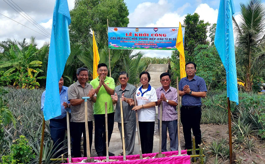 Ảnh: Lãnh đạo Hội nông dân tỉnh cùng chính quyền địa phương và đơn vị tài trợ thực hiện nghi thức khởi công cầu GTNT tại xã Vĩnh Phước A.
