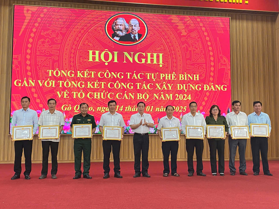 Ảnh: Đ/c Trần Thanh Việt (thứ 5 từ trái qua), Tỉnh ủy viên, Bí thư Huyện ủy tặng giấy khen cho các tổ chức có thành tích xuất sắc trong công tác xây dựng Đảng.