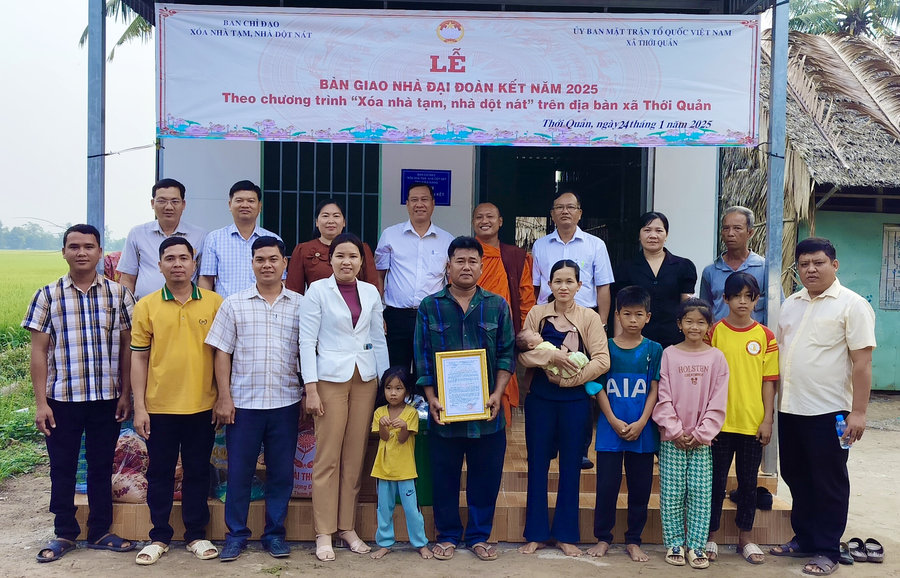 Ảnh: Đồng chí Chương Hoàng Tha (hàng trên, thứ năm từ phải qua) – Bí thư Đảng uỷ, Trưởng Ban chỉ đạo xoá nhà tạm nhà dột nát xã Thới Quản cùng các thành viên Ban chỉ đạo xã trao quyết định bàn giao nhà đại đoàn kết thực hiện phong trào xóa nhà tạm, nhà dột nát cho gia đình anh Danh Bền, ấp Hoà Lễ, xã Thới Quản.