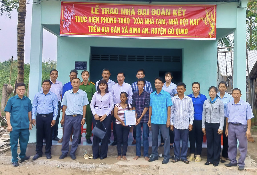 Ảnh: Đồng chí Trần Thanh Việt (hàng trên, thứ ba từ phải qua) – Tỉnh ủy viên, Bí thư Huyện ủy, Trưởng Ban chỉ đạo xoá nhà tạm nhà dột nát huyện Gò Quao dự lễ bàn giao nhà đại đoàn kết thực hiện phong trào xóa nhà tạm, nhà dột nát cho gia đình chị Thị Thu Hường, ngụ ấp An Thuận, xã Định An.