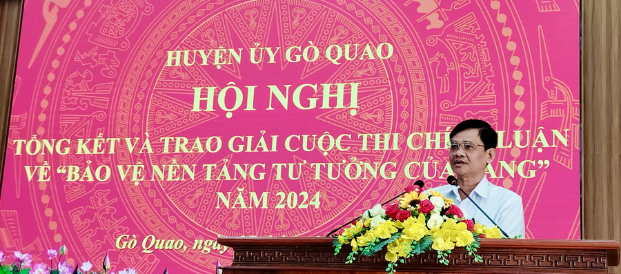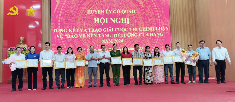 Dịp này, Huyện uỷ Gò Quao đã tặng giấy khen cho 05 tập thể và 20 cá nhân có thành tích trong công tác bảo vệ nền tảng tư tưởng của Đảng năm 2024; khen thưởng 3 tập thể, 14 cá nhân có thành tích cao trong tham gia cuộc thi Chính luận về bảo vệ nền tảng tư tưởng của Đảng huyện Gò Quao năm 2024. Khen thưởng 02 tập thể, 04 cá nhân; tặng giấy biểu dương 01 tập thể và 05 cá nhân, là gương người tốt, việc tốt làm theo Bác với chủ đề “Chúng tôi là công dân, cán bộ, đảng viên và tập thể tốt” quý III/2024./.