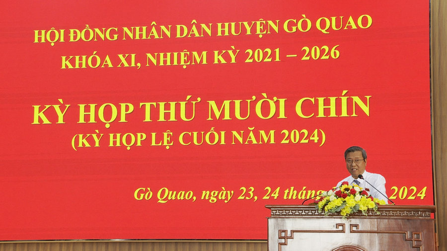 Sau nội dung chất vấn, trả lời chất vấn, kỳ họp đã tiến hành thông qua Nghị quyết của kỳ họp. Theo đó, trên cơ sở các dự thảo Nghị quyết đã được xem xét, thảo luận, HĐND huyện đã tiến hành biểu quyết thông qua 8 Nghị quyết gồm: Nghị quyết về nội dung, chương trình tổ chức kỳ họp lệ năm 2025 của Hội đồng nhân dân huyện; Nghị quyết về phê duyệt nhiệm vụ phát triển kinh tế xã hội năm 2025; Nghị quyết về điều chỉnh, bổ sung kế hoạch đầu tư công Trung hạn giai đoạn 2021-2025; Nghị quyết về việc xin điều chỉnh một số điểm của Nghị quyết số 03, ngày 25/7/2024 của Hội đồng nhân dân huyện Gò Quao về việc phê duyệt chủ trương đầu tư xây dựng cầu ba Hồ, xã Vĩnh Hòa Hưng Bắc; Nghị quyết về việc xin điều chỉnh một số điểm của Nghị quyết số 10, ngày 15/10/2024 của Hội đồng nhân dân huyện Gò Quao về việc chấp thuận điều chỉnh chủ trương đầu tư Dự án Tuyến đường ven sông ba Voi, xã Vĩnh Hòa Hưng Nam; Nghị quyết về dự toán thu ngân sách nhà nước trên địa bàn, thu chi ngân sách địa phương năm 2025; Nghị quyết về phê duyệt kế hoạch đầu tư công vốn ngân sách Nhà nước năm 2025 trên địa bàn huyện; Nghị quyết về kế hoạch sử dụng đất năm 2025.