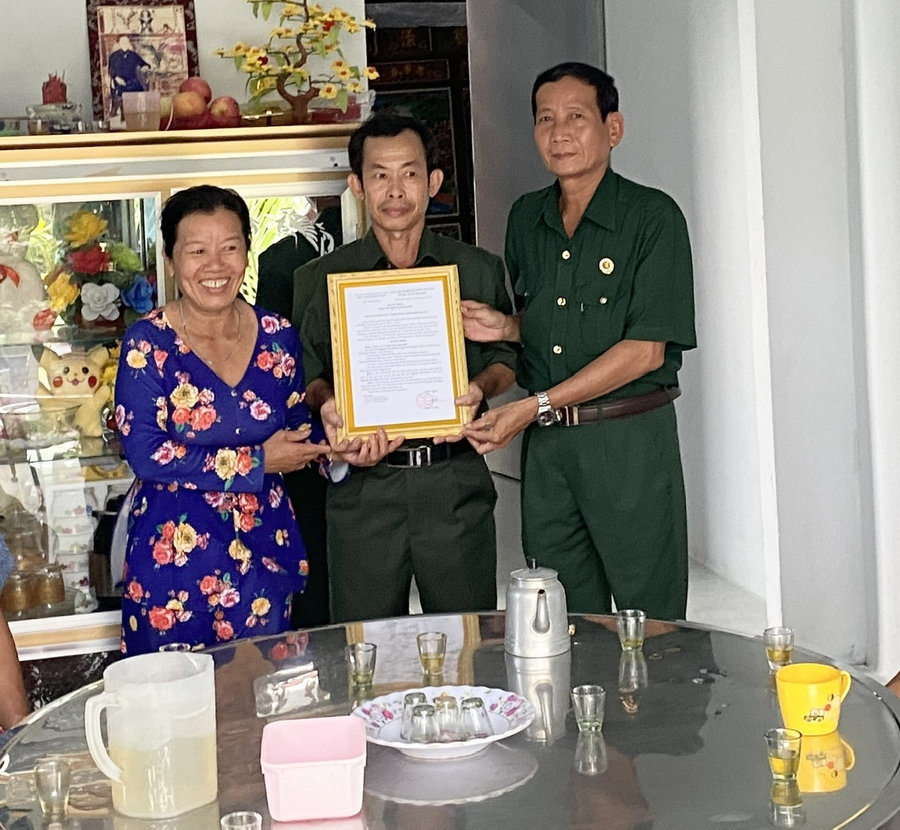 Ảnh: Đồng chí Lương Văn Mau – Chủ tịch Hội CCB huyện (bìa phải), trao quyết định bàn giao nhà “Nghĩa tình đồng đội” cho hộ ông Nguyễn Văn Mau.