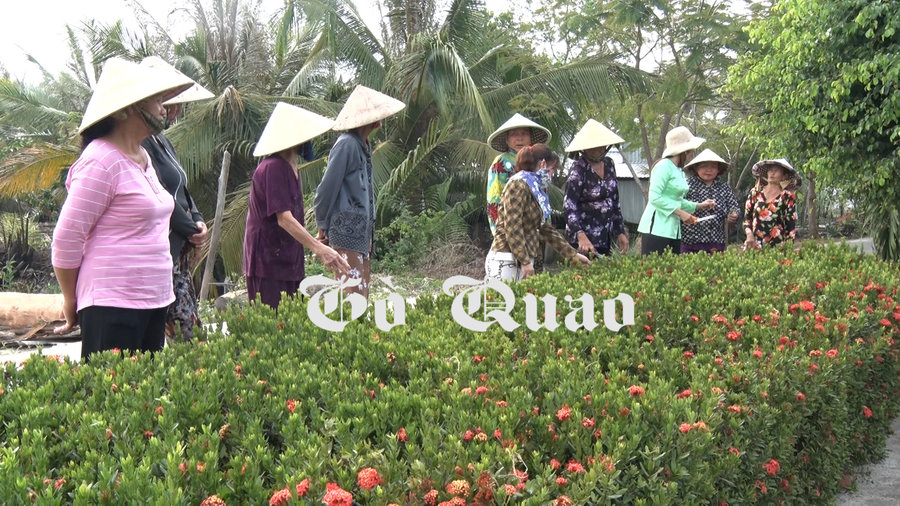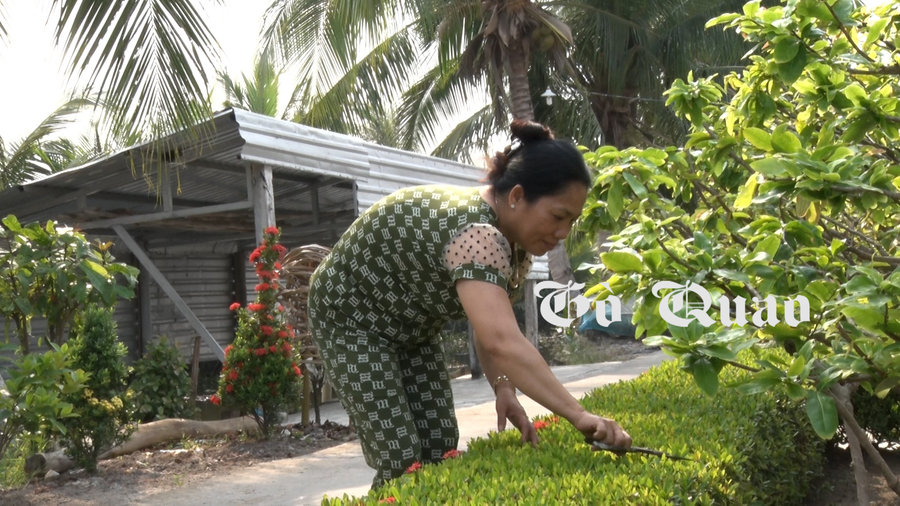 Ảnh: Chị em phụ nữ ấp Phước An chăm sóc hàng rào cây xanh trước nhà.