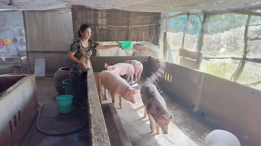 Ảnh: Bà Lê Thị Nga, hội viên phụ nữ ấp Phước Thọ, xã Vĩnh Phước B sử dụng chế phẩm IMO để tạt rửa chuồng nuôi heo hạn chế mùi hôi ra môi trường.