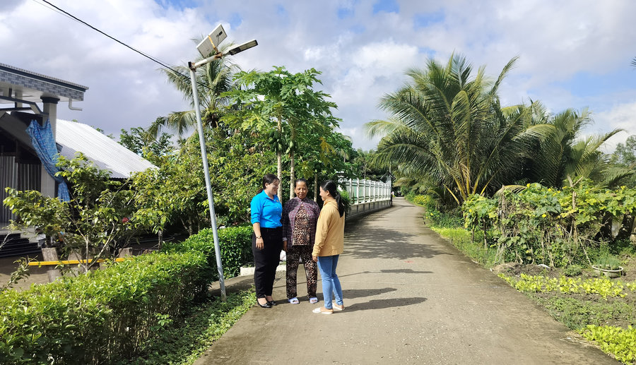 Ảnh: Đồng chí Nguyễn Thị Chúc Ly (ngoài cùng bên trái) – Chủ tịch Hội Liên hiệp phụ nữ xã Vĩnh Phước B trao đổi với bà Thị Hồng Huệ (giữa), thành viên câu lạc bộ bảo vệ môi trường ấp An Hòa về việc thực hiện các nội dung bảo vệ môi trường tại gia đình.