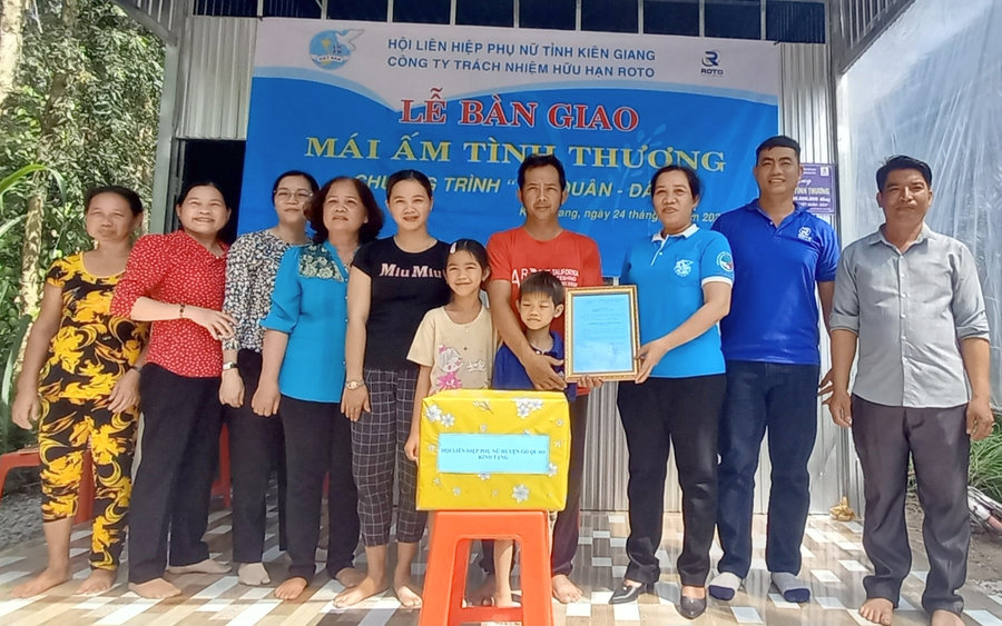 Ảnh: Đồng chí Nguyễn Thị Hòa Hiệp (thứ 3 từ phải qua) – Phó Chủ tịch Hội Liên hiệp phụ nữ tỉnh Kiên Giang trao quyết định bàn giao nhà mái ấm tình thương cho vợ chồng chị Phan Thị Tấc, hội viên phụ nữ ấp 3, xã Vĩnh Hòa Hưng Bắc.