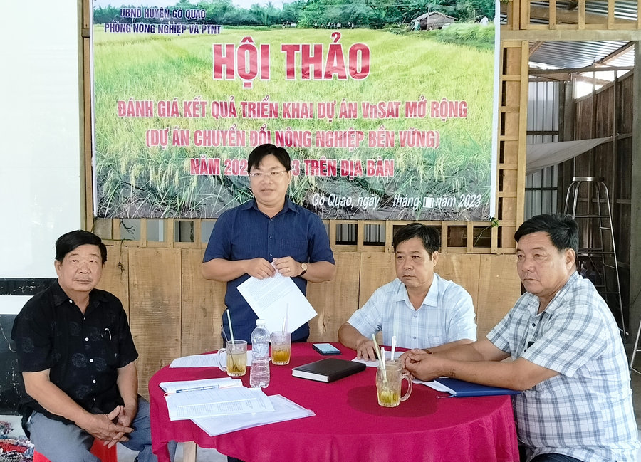Thực hiện dự án VnSAT mở rộng trên cây lúa năm 2022 - 2023 trên địa bàn huyện Gò Quao, Tổ thực hiện Dự án VnSAT huyện phối hợp với Trung tâm Dịch vụ nông nghiệp, UBND các xã, thị trấn tham gia Dự án triển khai được 18 cuộc Hội nghị truyền thông với 900 nông dân tham gia chủ yếu tập trung ở các tổ hợp tác, hợp tác xã quy hoạch tham gia mở rộng thực hiện dự án.