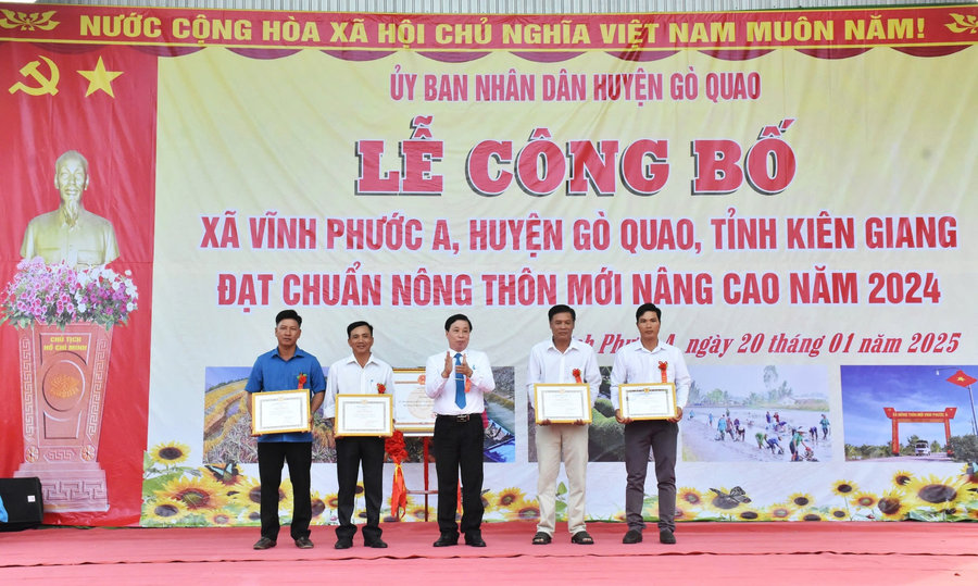 Dịp này, Huyện ủy Gò Quao tặng giấy khen cho các chi bộ trực thuộc Đảng bộ xã Vĩnh Phước A đạt thành tích hoàn thành xuất sắc nhiệm vụ công tác chỉ đạo, vận động xây dựng xã nông thôn mới nâng cao. Ủy ban nhân dân huyện Gò Quao; UBND xã Vĩnh Phước A cũng tặng giấy khen cho các tập thể, cá nhân đạt thành tích xuất sắc tiêu biểu trong xây dựng xã đạt chuẩn nông thôn mới nâng cao năm 2024.