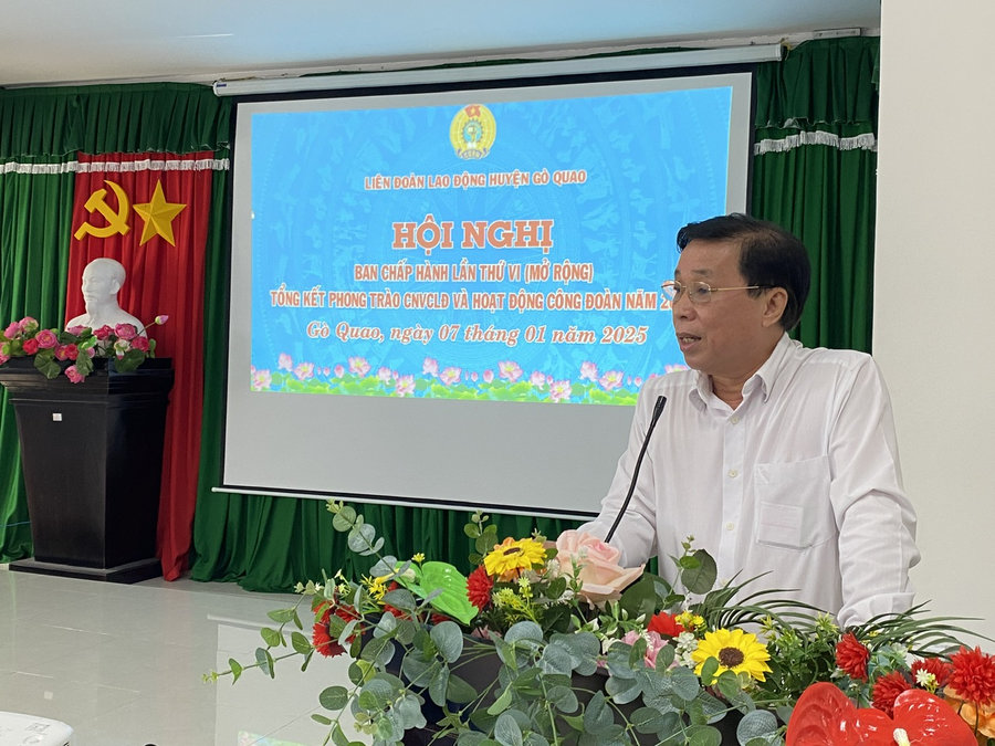 Phát biểu chỉ đạo tại Hội nghị, đồng chí Trần Thanh Việt – Tỉnh ủy viên, Bí thư Huyện ủy, biểu dương, ghi nhận những kết quả mà LĐLĐ huyện đạt được trong năm 2024. Năm 2025, là năm đặc biệt quan trọng và có ý nghĩa trong việc thi đua lập thành tích thiết thực chào mừng Đại hội đảng các cấp. Là năm thứ hai thực hiện Nghị quyết đại hội đại hội công đoàn các cấp, nhiệm kỳ 2023- 2028. Với chủ đề hoạt động công đoàn“Tập trung phát triển đoàn viên; thành lập CĐCS; tham gia xây dựng Đảng trong sạch, vững mạnh”. Đồng chí đề nghị các cấp công đoàn trong huyện cần tiếp tục đổi mới nội dung, phương thức hoạt động, thực hiện tốt chức năng đại diện bảo vệ quyền và lợi ích hợp pháp, chính đáng của CNVCLĐ; làm tốt công tác tuyên truyền, giáo dục chính trị tư tưởng cho CNVCLĐ; tuyên truyền vận động cán bộ, đoàn viên, CNVCLĐ thực hiện tốt các nhiệm vụ theo sự chỉ đạo, định hướng của LĐLĐ tỉnh và nhiệm vụ chính trị của huyện trên các lĩnh vực phát triển kinh tế, xã hội, đảm bảo quốc phòng, an ninh, xây dựng Đảng, xây dựng hệ thống chính trị vững mạnh. Làm tốt công tác nắm tình hình, tâm tư nguyện vọng của đoàn viên công đoàn cơ sở. Tiếp tục làm tốt nhiệm vụ quan tâm, chăm lo, bảo vệ quyền, lợi ích hợp pháp của đoàn viên công đoàn, làm tốt công tác xã hội hoá để chăm lo cho đoàn viên công đoàn có hoàn cảnh khó khăn… Trước mắt tập trung chăm lo dịp Tết Nguyên đán Ất Tỵ cho đoàn viên, CNVCLĐ có hoàn cảnh khó khăn trợ kịp thời, đúng đối tượng. Tiếp tục đẩy mạnh các phong trào thi đua tại cơ sở, có trọng tâm, trọng điểm bằng các phong trào cụ thể, phù hợp theo từng mô hình hoạt động của công đoàn cơ sở.