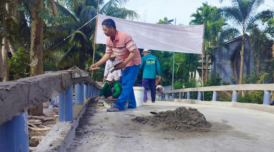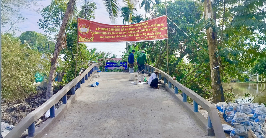 Ảnh: Đội thi công cầu xã Định An đang xây dựng cầu liên ấp An Minh – An Thuận, một trong những công trình chào mừng Đại hội Đảng bộ xã lần thứ XIV (nhiệm kỳ 2025-2030) và tiến tới Đại hội Đảng toàn quốc.