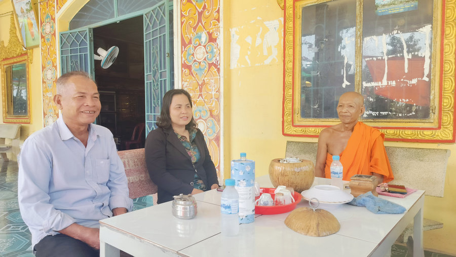Ảnh: Ông Danh Điện (ngoài cùng bên trái) thường xuyên phối hợp cùng cấp ủy, chính quyền và chùa Cỏ Khía cũ tuyên truyền, vận động người dân, đồng bào phật tử chấp hành tốt các chủ trương của Đảng, chính sách, pháp luật của Nhà nước, tích cực tham gia các phong trào thi đua yêu nước ở địa phương.