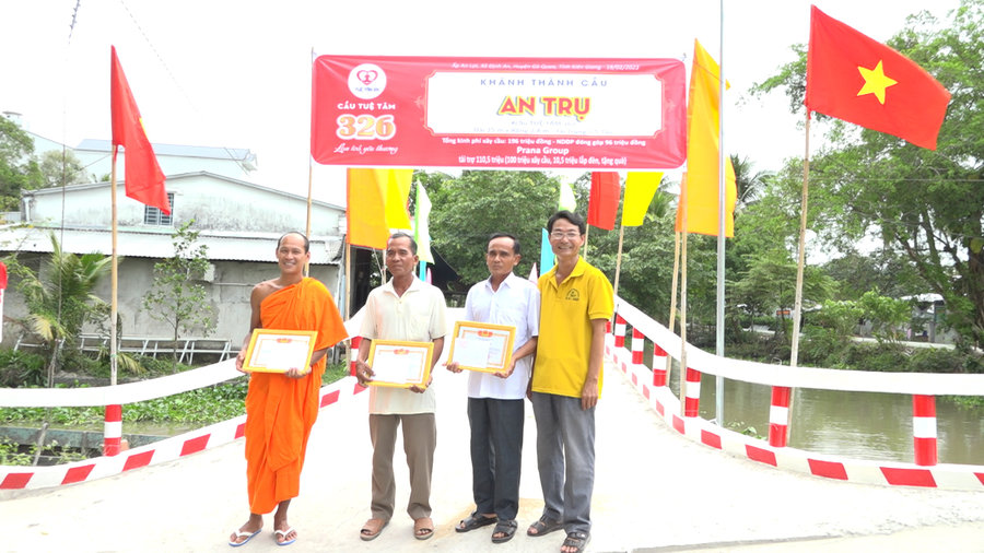 Ảnh: Ông Danh Hùng (thứ 2, từ trái qua) được Ủy ban nhân dân xã Định An tặng giấy khen vì có đóng góp tích cực tham gia xây dựng cầu An Trụ, tại ấp An Lợi, năm 2023.