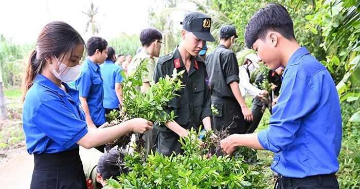Ảnh: Lực lượng cảnh sát cơ động cùng đoàn viên thanh niên xã Vĩnh Hòa Hưng Nam ra quân trồng hoa, xây dựng tuyến đường xanh-sạch-đẹp.