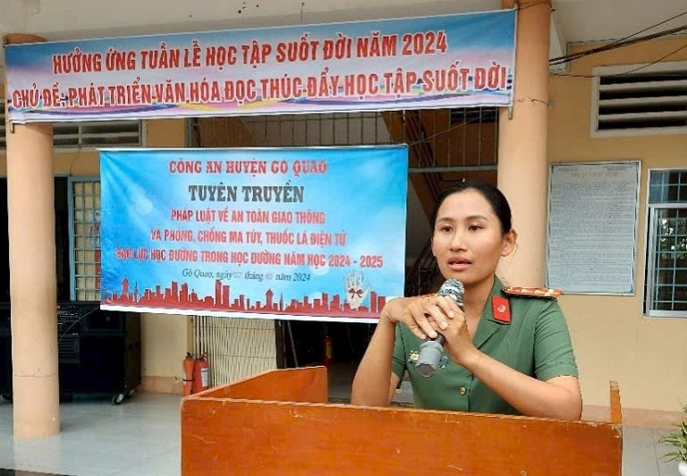 Ảnh: Đại úy Hồ Thị Mộng Kha trong một buổi tuyên truyền pháp luật về an toàn giao thông và phòng chống ma tuý, thuốc lá điện tử, bạo lực học đường trong trường học tại trường Phổ thông dân tộc nội trú – Trung học cơ sở Gò Quao.