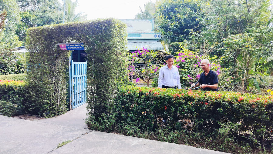 Ảnh: Là thành viên tích cực của tổ NDTQCĐ ấp 4, ông Đào Văn Của luôn chấp hành tốt chủ trương của Đảng, chính sách pháp luật của Nhà nước, tích cực tham gia xây dựng NTM. Trong ảnh: Ông Đào Văn Của (bên phải) trao đổi cùng đồng chí Lê Thanh Tổng - Phó Chủ tịch Ủy ban MTTQ xã Vĩnh Hòa Hưng Bắc về việc trồng cây xanh làm hàng rào của gia đình.