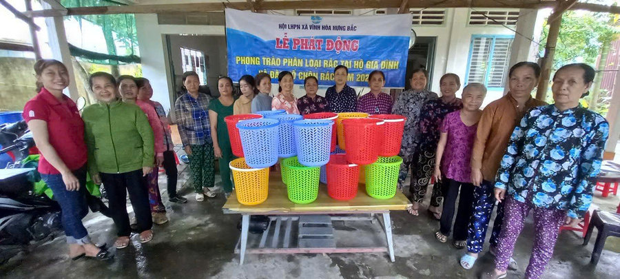 Ảnh: Lễ phát động phong trào phân loại rác tại hộ gia đình trên địa bàn xã Vĩnh Hòa Hưng Bắc.
