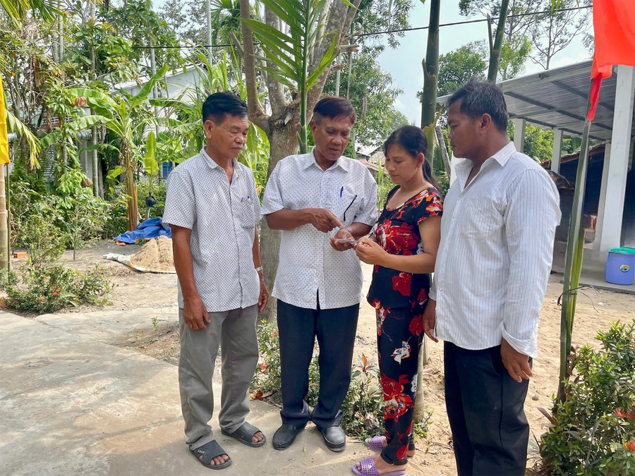 Ảnh: Ông Danh Sanh (thứ hai, bên trái qua) – Bí thư chi bộ kiêm Trưởng ấp Hòa Hớn, xã Định Hòa (Gò Quao) tuyên truyền quyền lợi tham gia bảo hiểm y tế đến người dân.
