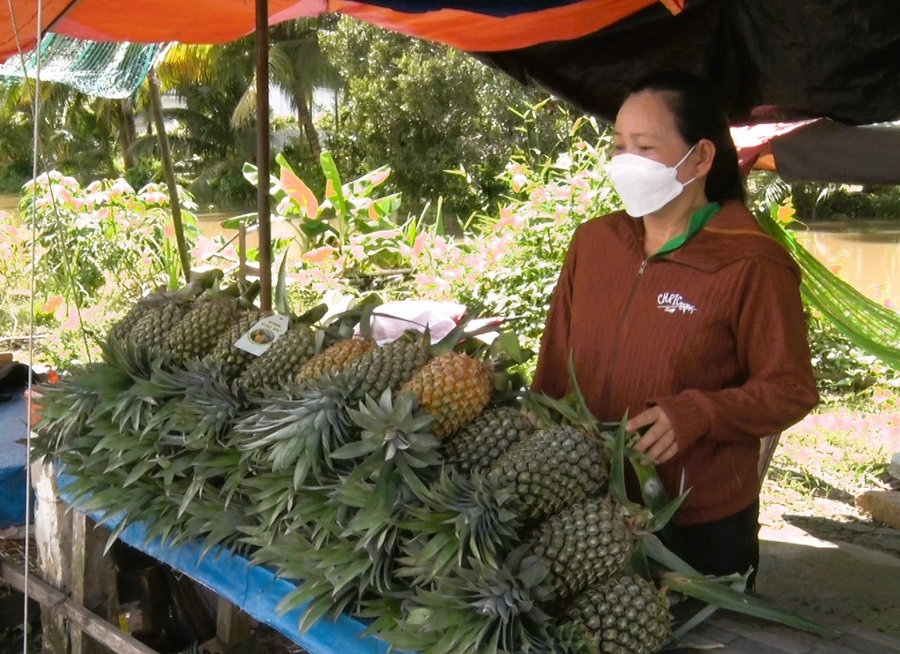 Ảnh: Chị Trương Thu Mè - Tổ trưởng tổ hợp tác trồng khóm ấp Tạ Quang Tỷ, xã Vĩnh Hòa Hưng Nam giới thiệu sản phẩm Khóm Cái Tư Vĩnh Hòa Hưng Nam.