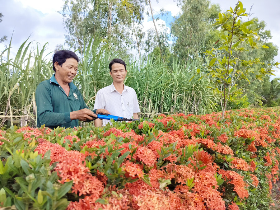 Ảnh: Đồng chí Lê Tấn Lên (bên phải), Bí thư chi bộ, Trưởng ấp Thới Đông, xã Thới Quản trao đổi với người dân trong ấp về việc trồng hoa làm hàng rào, xây dựng cảnh quan xanh sạch đẹp.