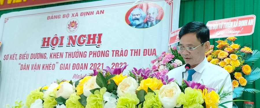 Phát biểu chỉ đạo hội nghị sơ kết, biểu dương, khen thưởng phong trào thi đua “Dân vận khéo” xã Định An giai đoạn 2021-2023 đồng chí Nguyễn Xuân Hoài - Phó Bí thư Thường trực huyện ủy, Chủ tịch Hội đồng nhân dân huyện, Trưởng Ban Chỉ đạo Phong trào thi đua “Dân vận khéo” huyện đã biểu dương những kết quả Ban Chỉ đạo Phong trào thi đua “Dân vận khéo” xã Định An đã đạt được trong giai đoạn 2021 - 2023. Đồng thời, đồng chí yêu cầu trong thời gian tới, Ban Chỉ đạo Phong trào thi đua “Dân vận khéo” xã tiếp tục phát huy những kết quả đạt được, đẩy mạnh tuyên truyền các văn bản chỉ đạo của cấp trên về công tác thi đua Dân vận khéo tới toàn thể cán bộ, đảng viên và Nhân dân nhất là Công văn số 70-CV/TU, ngày 02/02/2021 của Ban Thường vụ Tỉnh ủy về tiếp tục triển khai, thực hiện Phong trào thi đua “Dân vận khéo”, giai đoạn 2021-2025; Công văn số 78-CV/HU, ngày 26/3/2021 của Ban Thường vụ Huyện ủy về chỉ đạo thực hiện phong trào thi đua “Dân vận khéo” trong hệ thống chính trị trên địa bàn giai đoạn (2021-2025).
