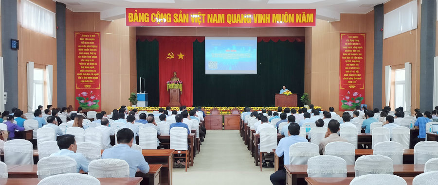 Ảnh: Hội nghị tập huấn kỹ năng chuyển đổi số cho đội ngũ cán bộ Dân vận, Mặt trận Tổ quốc, các tổ chức chính trị-xã hội, hội quần chúng do Đảng, Nhà nước giao nhiệm vụ trên địa bàn huyện năm 2024 do Ban Dân vận Huyện ủy Gò Quao phối hợp với Sở Thông tin và Truyền thông tỉnh Kiên Giang tổ chức.