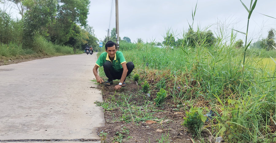Ảnh: Ông Lê Văn Mười tự tay làm cỏ, trồng hoa xây dựng tuyến đường xanh - sạch - đẹp của tổ.