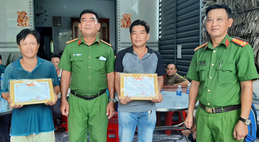 Ảnh: Đồng chí Trung tá Danh Thật (thứ hai từ trái sang) – Trưởng Công an xã Vĩnh Phước B trao giấy khen cho 02 cá nhân có thành tích xuất sắc trong truy bắt đối tượng.